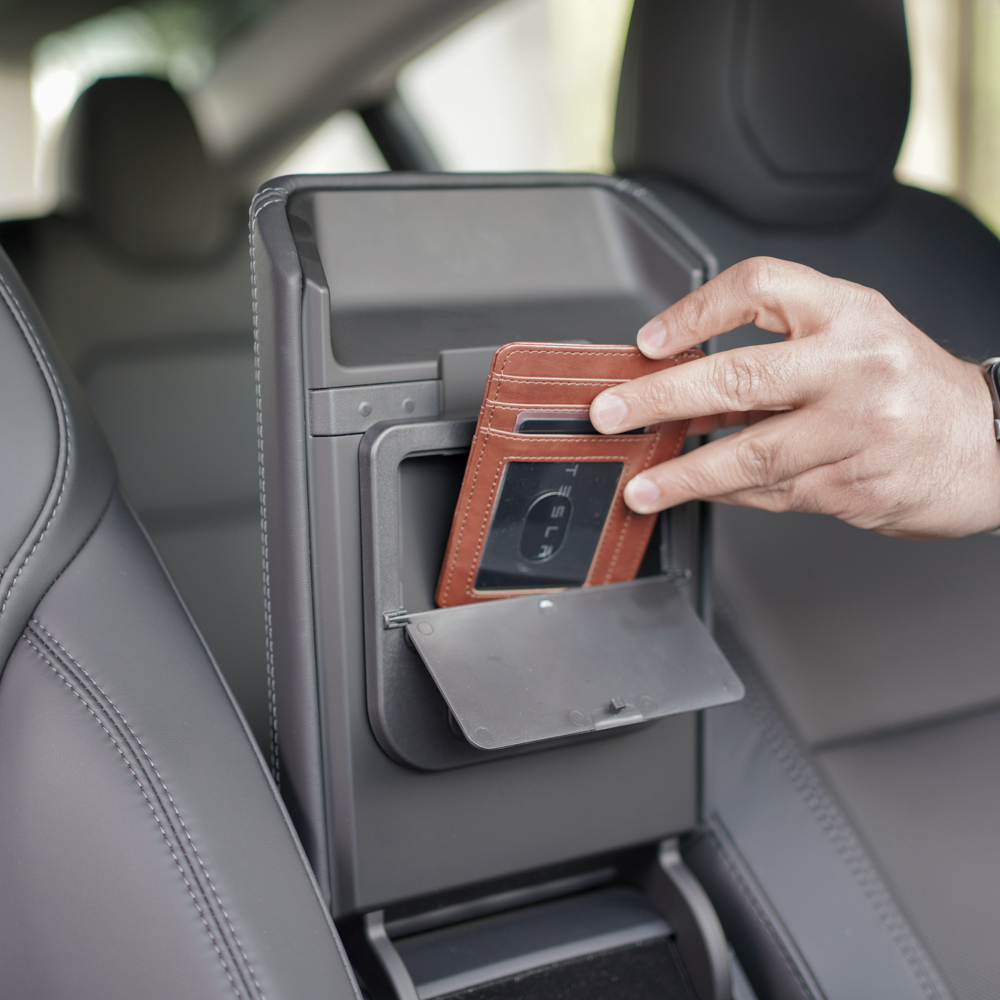 Tesloid armrest hidden storage slot for Tesla Model 3 and Model Y discreetly makes use of the unused space in the armrest. This hidden compartment can be used to store a wallet, cards, or keys.